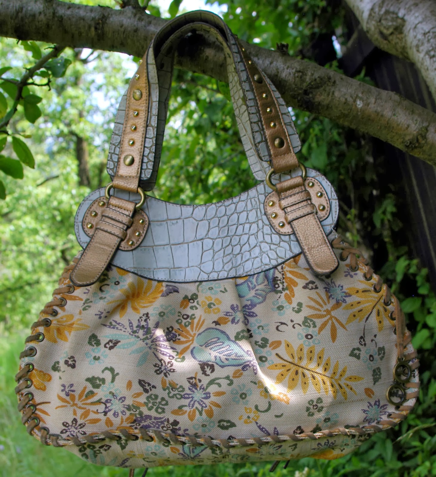 Poseta GUESS autentica , din material textil grosut ( asemanator denimului ) cu imprimeu floral si piele naturala auriu / cupru